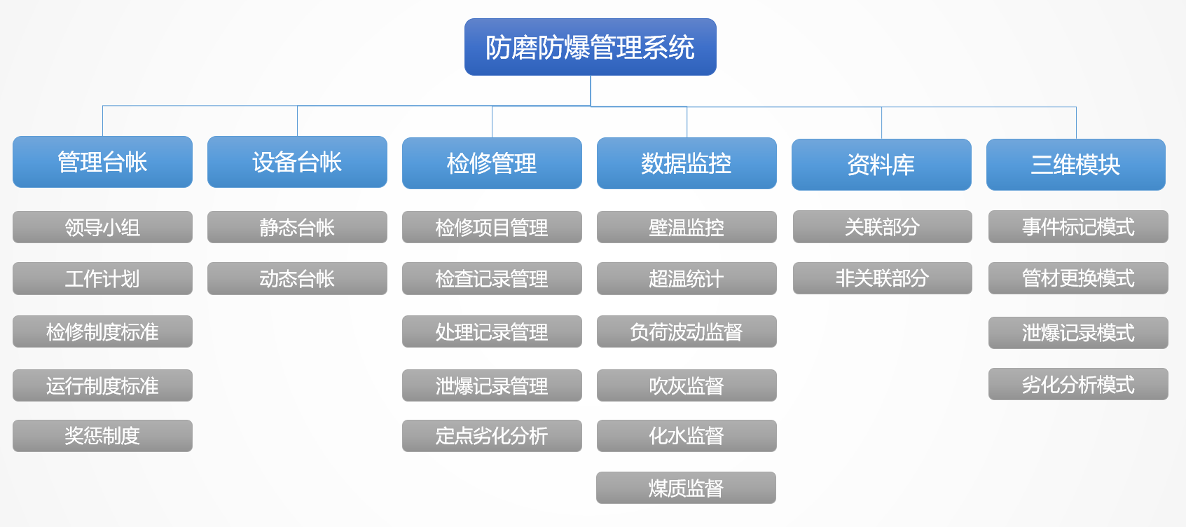 我國火力發(fā)電廠各種事故中,鍋爐事故約占發(fā)電廠總事故的70%以上,而過熱器、再熱器、省煤器、水冷壁四類管(簡稱“四管”)泄漏與爆破事故時有發(fā)生,在眾多事故中出現(xiàn)較多,約占鍋爐總事故的70%以上,成為困擾火力發(fā)電廠安全生產(chǎn)的一大難題。針對這一問題,云酷科技設(shè)計(jì)了防磨防爆可視化管理系統(tǒng)。